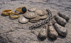 But there … Just saying, how damn frustrating that I can’t visit my favourite winter storm haunts to pluck gold and silver jewellery, gold rings, coinage and lead angling weights from the natural deep cracks in the revealed bedrock, it being the perfect gravity based medium to inhibit, trap and amass whatever lost or precious objects that had been unwittingly discarded by hundreds or thousands of holidaymaker or swimmers over the decades.