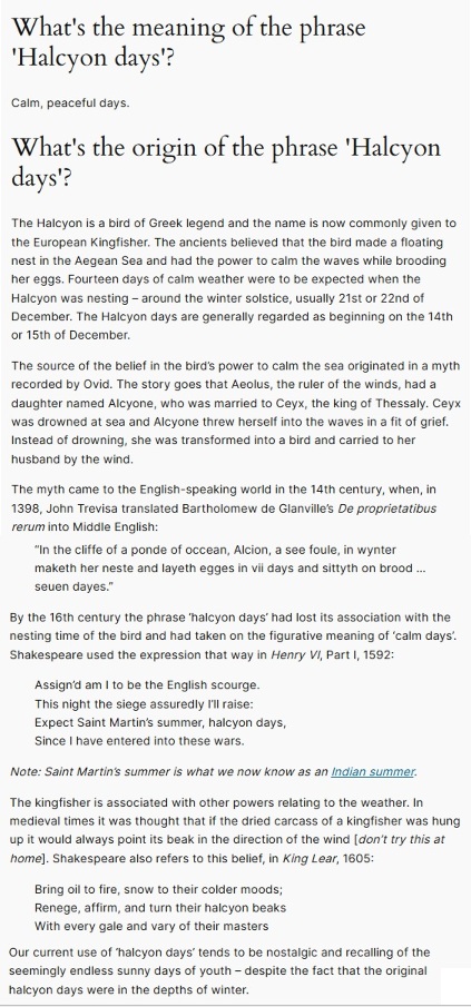 Despite the ancient Greek phrase referencing an expected event happening for just a few single days over December, its start date coincides with my very own birthday and I’ve always regarded “Kingfisher” or “Halcyon” days to represent nostalgic memories of precious por treasured moments of my youth.